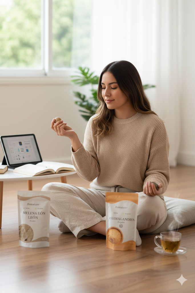 Por la noche: Mezcla media cucharadita de Ashwagandha con leche tibia, una pizca de canela y un poco de miel para relajarte antes de dormir. Si lo prefieres, disfruta de la Melena de León en una infusión suave para mantener la calma mientras sigues enfocado.